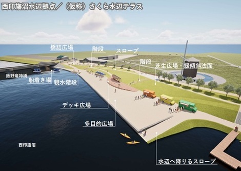 印旛沼と印旛放水路の水辺活用による賑わいの創出を図るため、印旛沼流域の3市(千葉市、八千代市、佐倉市)が、「印旛沼・印旛放水路かわまちづくり計画」を策定し、令和5年8月10日に国土交通省水管理・国土保全局に登録されました。 印旛沼・印旛放水路かわまちづくり計画に基づき、佐倉市と河川管理者である千葉県で、西印旛沼水辺拠点整備を行っていきます。